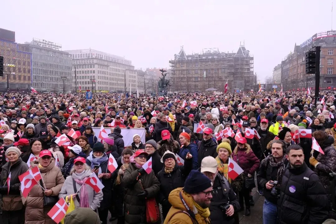1月17日,人们在丹麦首都哥本哈根的市政厅广场参加游行示威,抗议美国企图控制格陵兰岛的行径。新华社记者张玉亮 摄