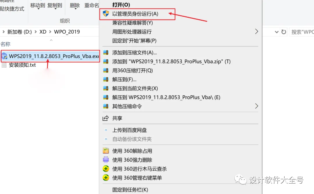 1.从百度云链接中下载后解压得到下图,首先我们WPS2019文件夹),然后右键以管理员身份运行,具体如下图:
