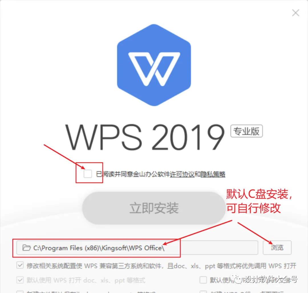 2.然后勾选已阅读….(系统默认安装c盘可以自行修改安装路径)具体步骤如下图: