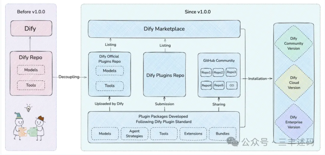 在 v1.0.0 之前,Dify 面临一个主要挑战:模型和工具紧密集成在核心平台中,添加新功能需要修改核心仓库,这减缓了开发速度并阻碍了创新。为解决这一问题,我们重构了 Dify 的架构并引入了插件系统,具有四大优势: