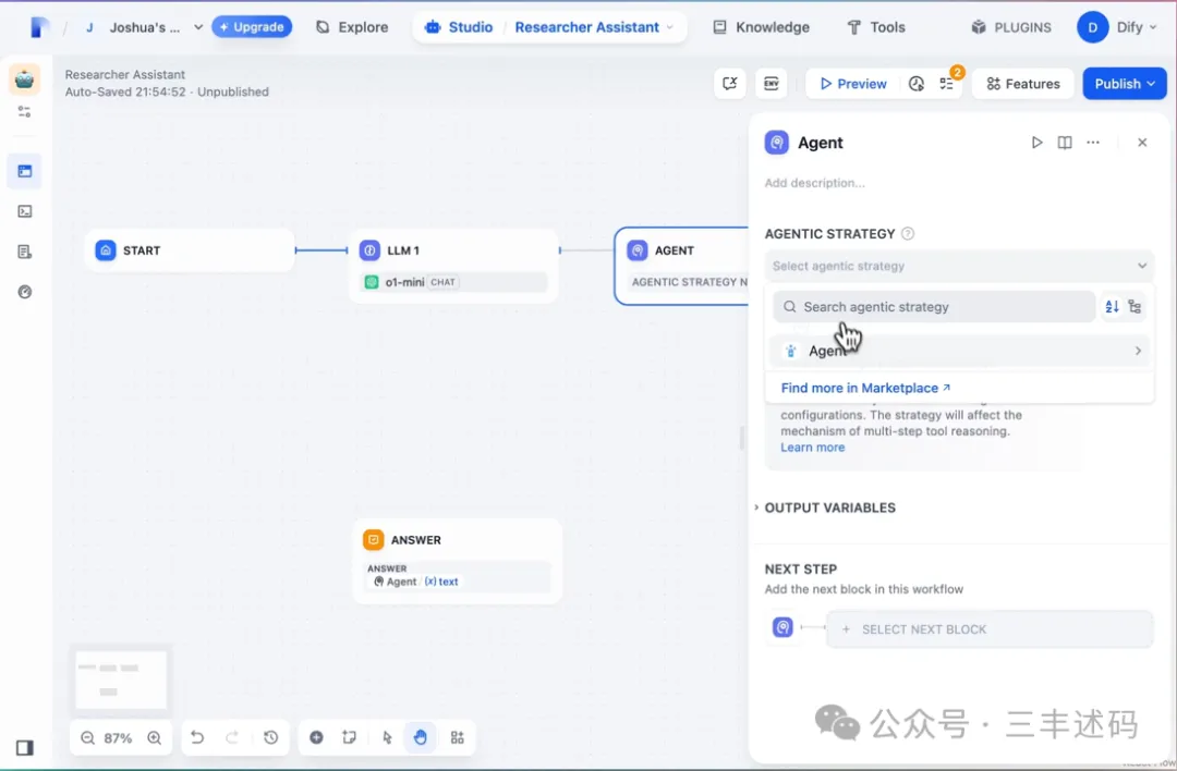 开发者可以使用 Dify 的工作流和聊天流节点灵活编排应用并解决复杂问题。Dify 专注于优化节点类型和功能,强调开放性以更好地满足开发者的多样化需求。v1.0.0 版本引入了代理节点,通过代理策略插件增强了推理策略,实现了工作流和聊天流的智能自主编排。