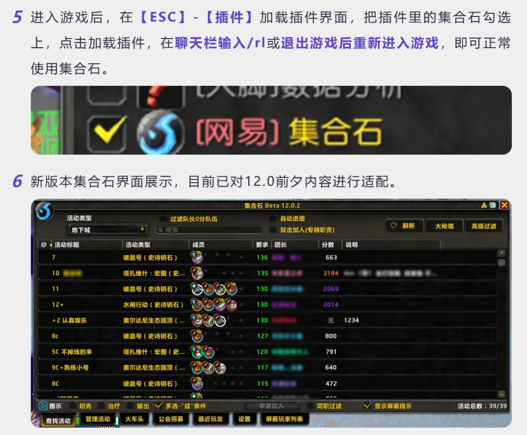 魔兽世界:集合石插件更新,官方专题进行推荐 在魔兽世界插件被禁后,玩家的组队问题也严重受损,很多独狼玩家苦于找不到队伍,各种社区和论坛也是哀鸿遍野。 官方发布专题问题,提醒玩家集合石插件已经更新,并且推荐玩家前往网易DD平台进行下载。