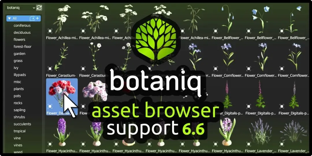 树木库botaniq是一个不断扩大的优化和逼真的3D植被库 – 主要是树木和草。它具有各种树木,草,花,杂草,蕨类植物,常春藤,棕榈树,多肉植物,灌木,杂草,植物,花盆,岩石,百合板和花园资产,用于建筑可视化,环境设计,渲染森林,景观美化或任何其他可以使用一些不同绿色植物的场景。