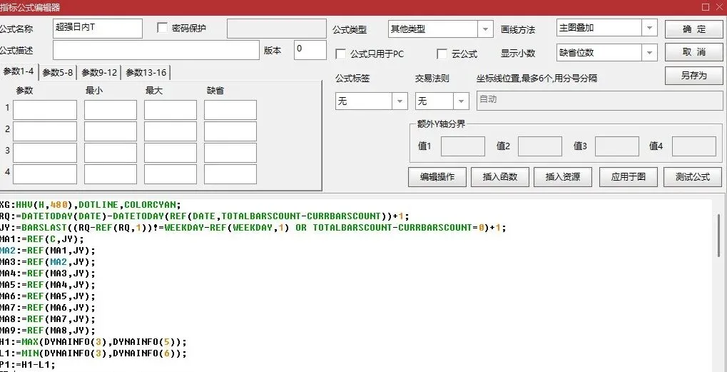 XG:HHV(H,480),DOTLINE,COLORCYAN; RQ:=DATETODAY(DATE)-DATETODAY(REF(DATE,TOTALBARSCOUNT-CURRBARSCOUNT))+1; JY:=BARSLAST((RQ-REF(RQ,1))!=WEEKDAY-REF(WEEKDAY,1) OR TOTALBARSCOUNT-CURRBARSCOUNT=0)+1; MA1:=REF(C,JY); MA2:=REF(MA1,JY);{捉妖指标特攻队公众号} MA3:=REF(MA2,JY); MA4:=REF(MA3,JY); MA5:=REF(MA4,JY); MA6:=REF(MA5,JY); MA7:=REF(MA6,JY); MA8:=REF(MA7,JY); MA9:=REF(MA8,JY); H1:=MAX(DYNAINFO(3),DYNAINFO(5)); L1:=MIN(DYNAINFO(3),DYNAINFO(6)); P1:=H1-L1; 阻力:L1+P1*8/9,COLORLIRED,DOTLINE; 支撑:L1+P1*0.5/9,COLORGREEN,DOTLINE; 均线:IF(BETWEEN(C/(SUM(AMOUNT,0)/SUM(VOL*100,0)),1.05,0.95)=0,MA(C,0),(SUM(AMOUNT,0)/SUM(VOL*100,0))),COLORYELLOW,DOTLINE; DIF:=(EMA(CLOSE,12)-EMA(CLOSE,26))+DYNAINFO(3); DEA:=EMA(DIF,9); MACD1:=10*(DIF-DEA); MACD2:=EMA(MACD1,2); STICKLINE(MACD1>=MACD2 AND MACD1>=0,DYNAINFO(3),MACD1+DYNAINFO(3),0,-1),COLORLIGRAY; STICKLINE(MACD1<MACD2 AND MACD1>0,DYNAINFO(3),MACD1+DYNAINFO(3),0,-1),COLORLICYAN; STICKLINE(MACD1>=MACD2 AND MACD1<0,DYNAINFO(3),MACD1+DYNAINFO(3),0,-1),COLORLIGRAY; STICKLINE(MACD1<MACD2 AND MACD1<0,DYNAINFO(3),MACD1+DYNAINFO(3),0,-1),COLORLIGREEN; XX:=SUM(AMOUNT,BARSCOUNT(CLOSE))/SUM(V*100,BARSCOUNT(CLOSE)); 主力:=EXPMA(CLOSE/XX,20);大户:=EXPMA(CLOSE/XX,60);散户:=EXPMA(CLOSE/XX,120); 底:=1;1.022,NODRAW;高:=1.033; DRAWTEXT(CROSS(主力,1.02),C*0.999,’ 拉’),COLORMAGENTA; DRAWICON(CROSS(主力,1.04),C,45); DRAWTEXT(CROSS(主力,1.04),C*0.999,’ 冲’),COLORRED; A1:=(VOL/CLOSE)/3; A2:=SUM((IF(((A1>40) AND (CLOSE>(REF(CLOSE,1)))),A1,0)),0); A3:=SUM((IF(((A1>40) AND (CLOSE<(REF(CLOSE,1)))),A1,0)),0); A4:=SUM((IF(((A1<40) AND (CLOSE>(REF(CLOSE,1)))),A1,0)),0); A5:=SUM((IF(((A1<40) AND (CLOSE<(REF(CLOSE,1)))),A1,0)),0); A6:=((A2+A3)+A4)+A5; A7:=IF((BARSTATUS=2),((100*A2)/A6),0); A8:=((IF((BARSTATUS=2),((100*A3)/A6),0))); A9:=((IF((BARSTATUS=2),((100*A4)/A6),0))); A10:=((IF((BARSTATUS=2),((100*A5)/A6),0))); DRAWTEXT(LONGCROSS(支撑,C,2),C-0.01,’ 买入’),COLOR0000FF; DRAWICON(LONGCROSS(支撑,C,2),C-0.01,1); STICKLINE(LONGCROSS(支撑,C,2),C,阻力,0,-1),COLORCYAN; DRAWTEXT(LONGCROSS(C,阻力,2),C+0.01,’ 卖出’),COLORGREEN; |