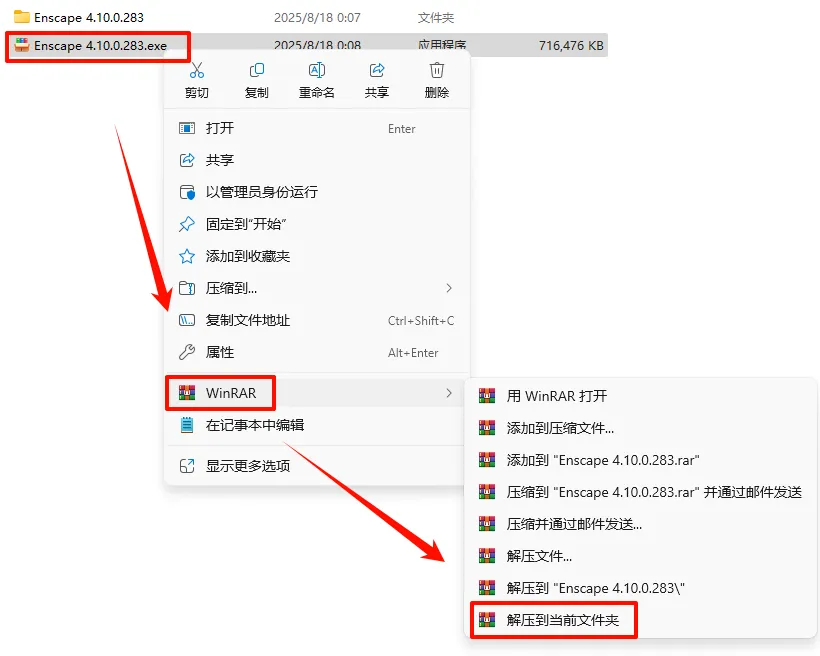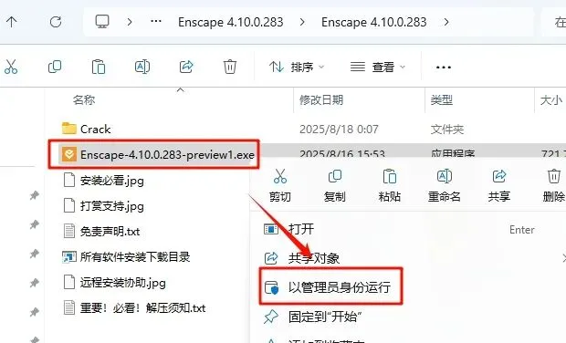 2.打开刚刚解压的文件夹,选中“Enscape-4.10.0.283-preview1.exe”文件,鼠标右键选择“以管理员身份运行”