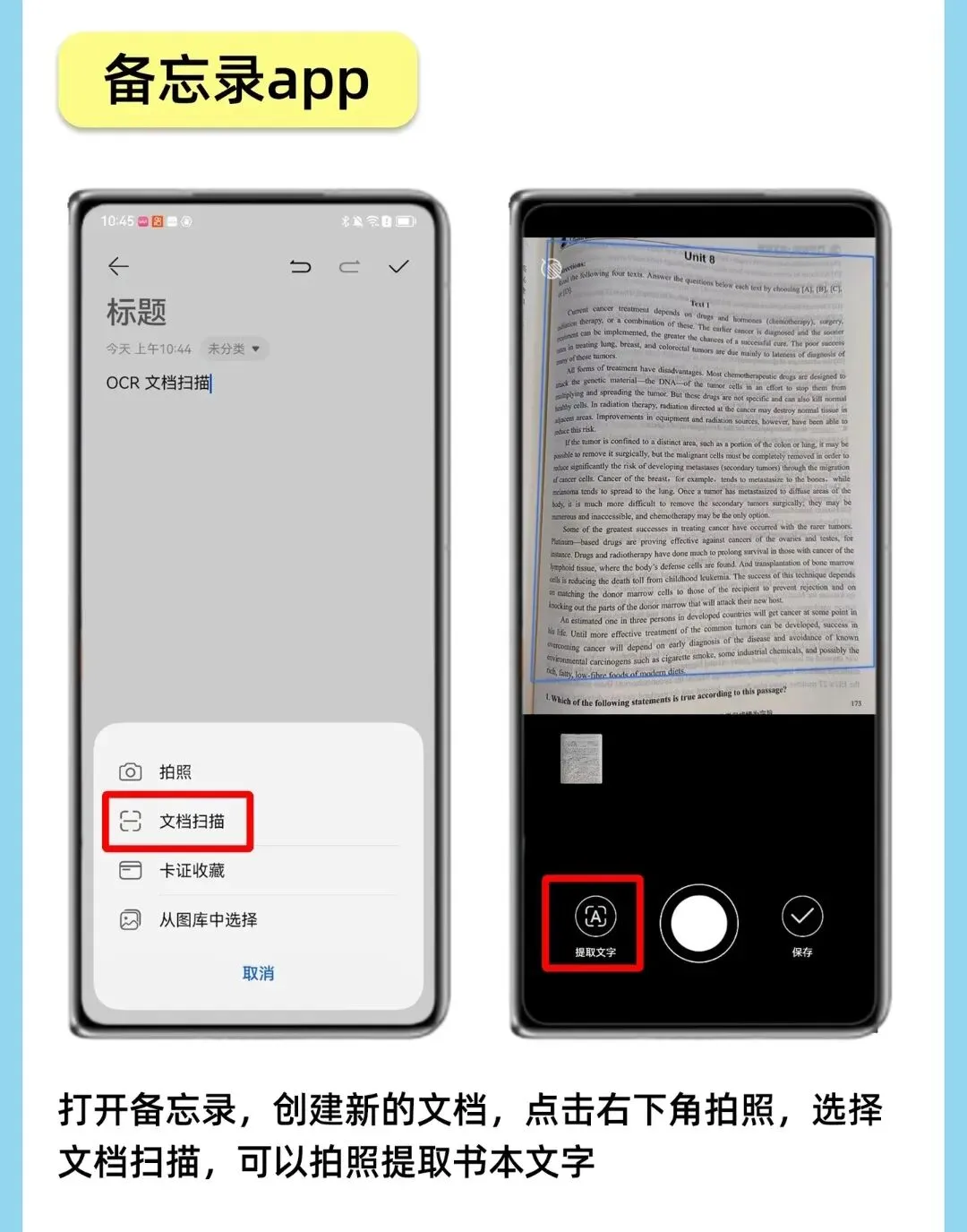 打开备忘录,点「+」→「扫描文档」,对着书本、合同一拍,就能自动提取文字,还能编辑、导出,准确率超高。