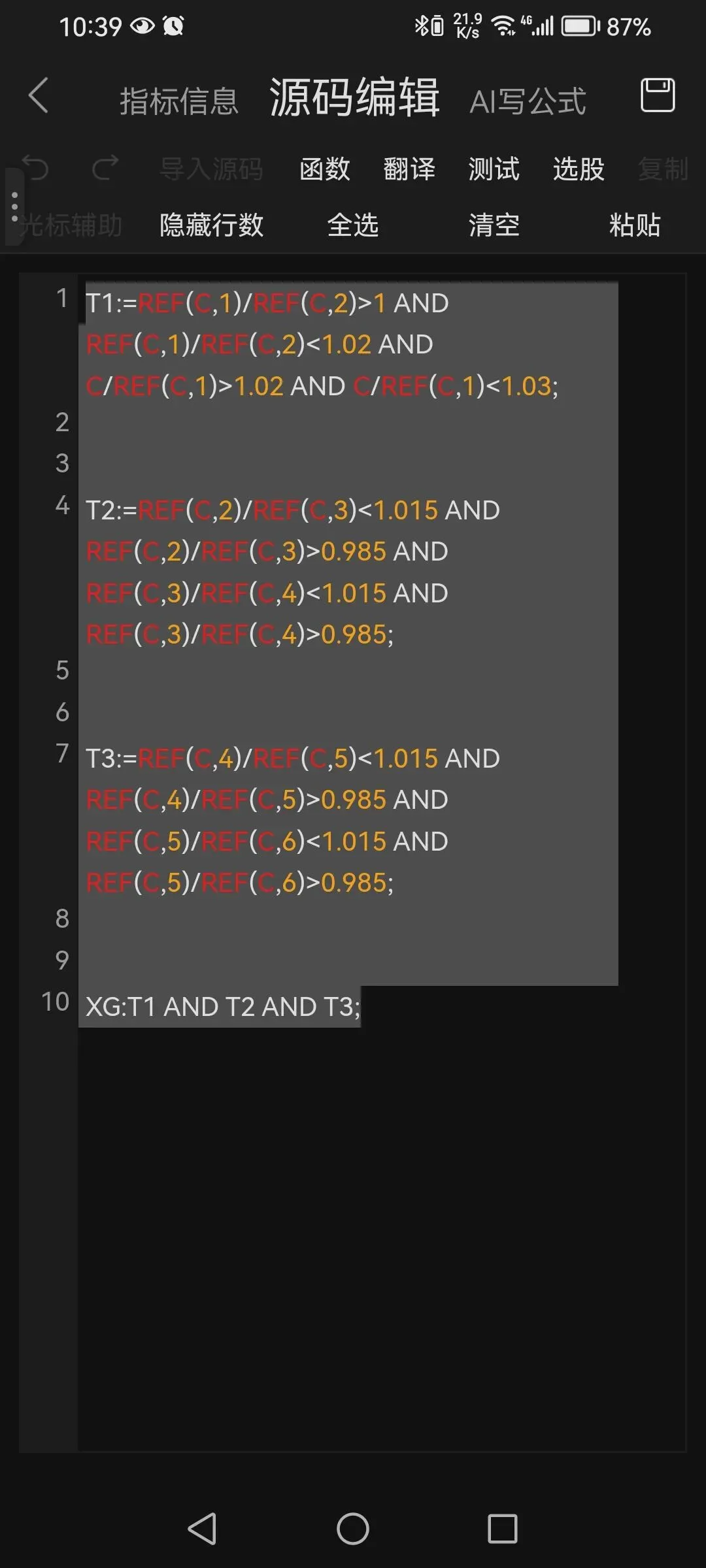 T3:=REF(C,4)/REF(C,5)<1.015 AND REF(C,4)/REF(C,5)>0.985 AND REF(C,5)/REF(C,6)<1.015 AND REF(C,5)/REF(C,6)>0.985;