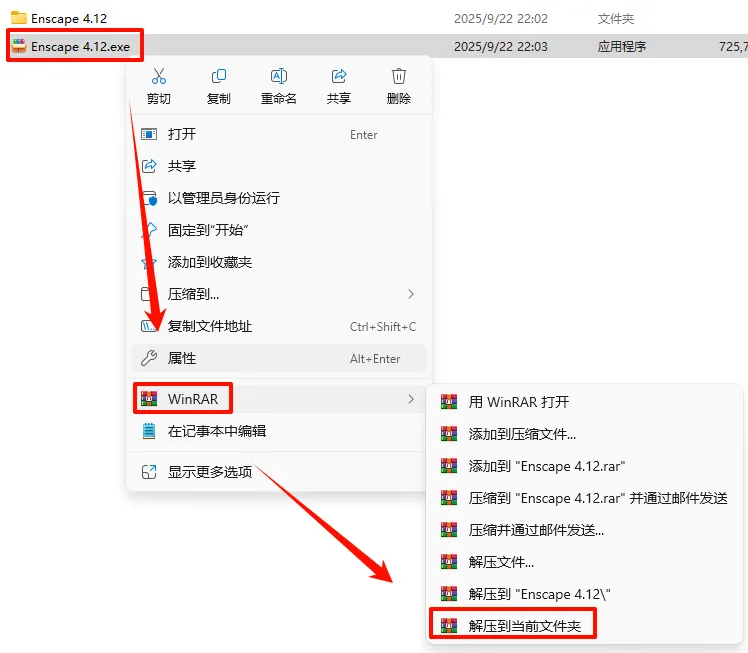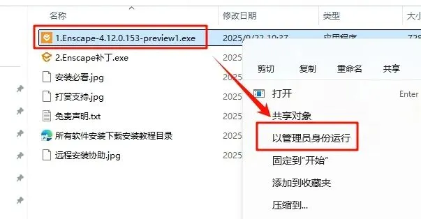 2.打开刚刚解压的文件夹,选中“1.Enscape-4.12.0.153-preview1.exe”文件,鼠标右键选择“以管理员身份运行”