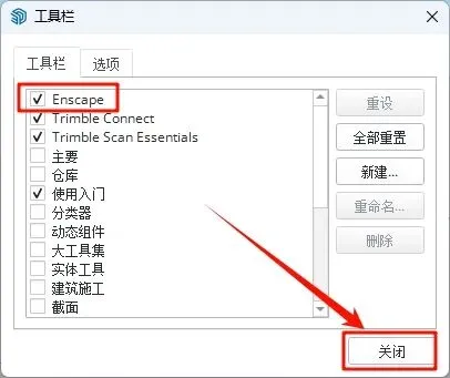 14.勾选“Enscape”选项就会出现Enscape工具栏,点击“关闭”