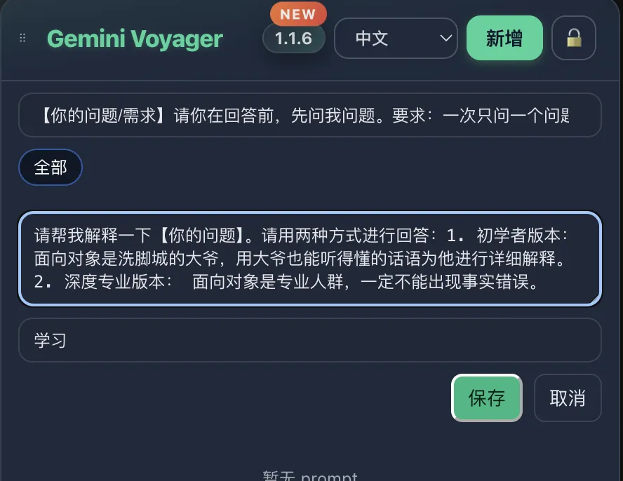 插件地址:https://chromewebstore.google.com/detail/gemini-voyager/kjdpnimcnfinmilocccippmododhceol
