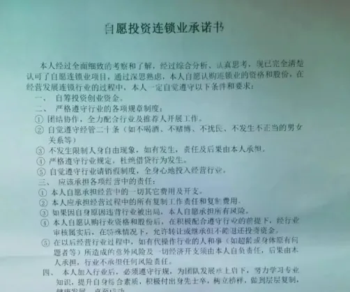 24. 贵州贵阳“自愿投资连锁业”:打着“资本运作”旗号,以找工作、网恋、旅游等名义将人骗至贵阳洗脑,鼓吹投资69800元可获1040万元回报。本质是异地传销,通过层级发展牟利,一旦加入,不仅会损失钱财,还可能沦为传销组织者的帮凶。