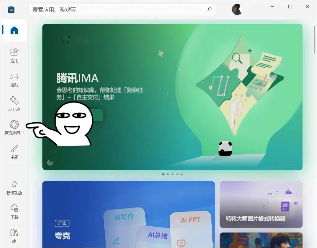 打开 Microsoft Store 微软应用商店后,就能在左侧边栏看到非常显眼的「腾讯应用宝」入口