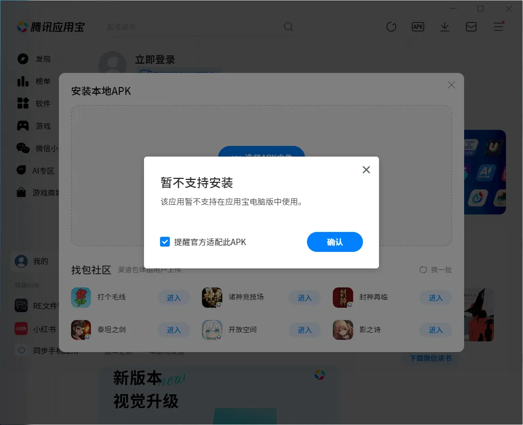 就是它并不能直接「双击安装」应用市场没有的任意第三方 APK(会弹提醒暂不支持安装)