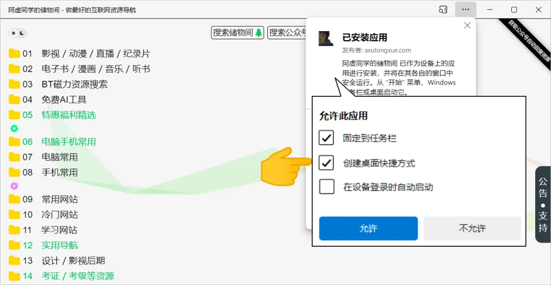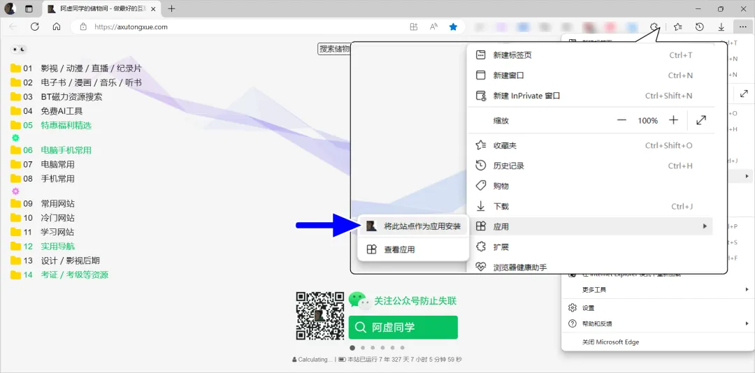比如 Edge 浏览器是点击右上方 ••• 后找到应用来「将网页作为应用安装」