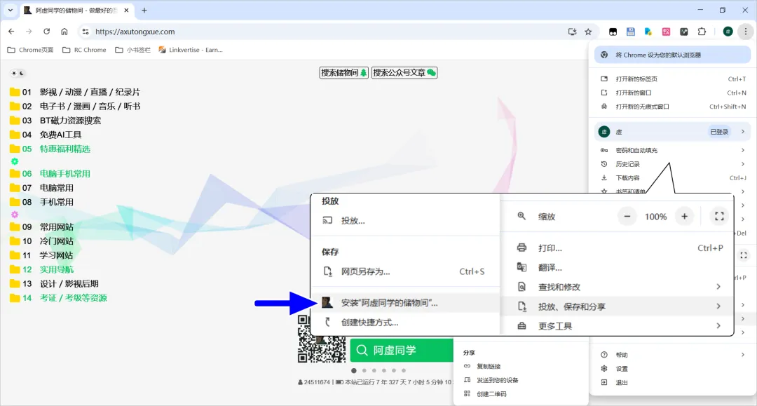 Chrome 同样是点击右上方 ┇ 然后找到「投放、保存和分享」这一功能,来安装网页