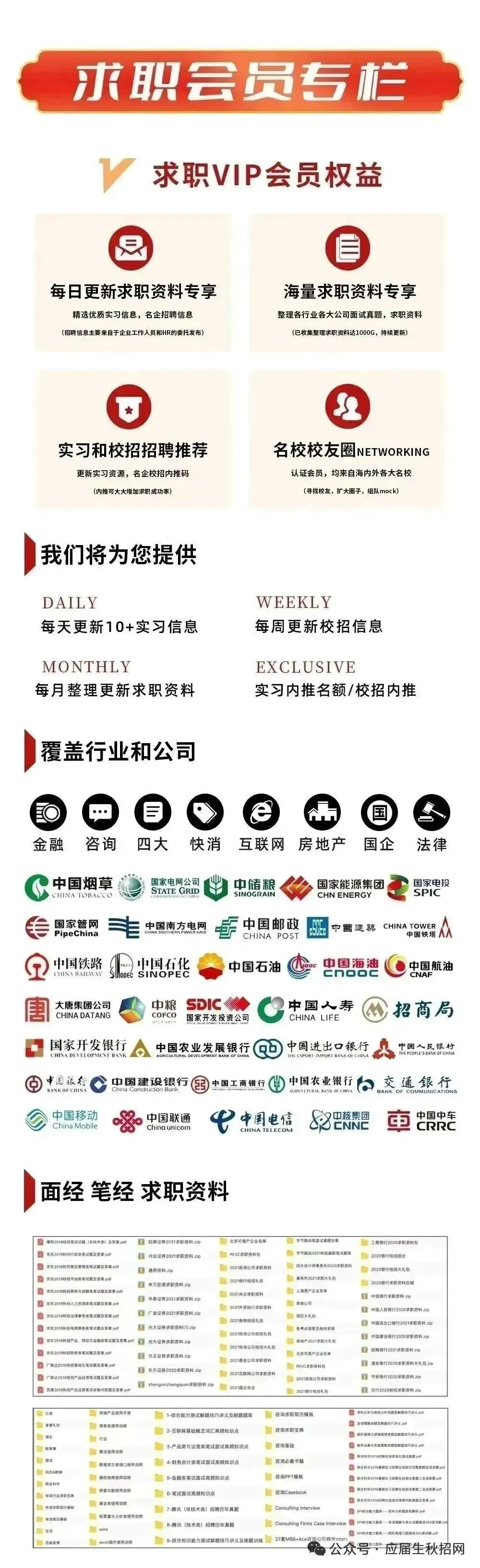 求职VIP会员:不仅仅有笔试面试资料,还有各类招聘信息、招聘汇总表,实习汇总表,比如春招汇总表、社招汇总表、外企汇总表、校招汇总表,暑期实习表,远程实习表,行业招聘汇总表等等,快速帮你发现理想的工作。
