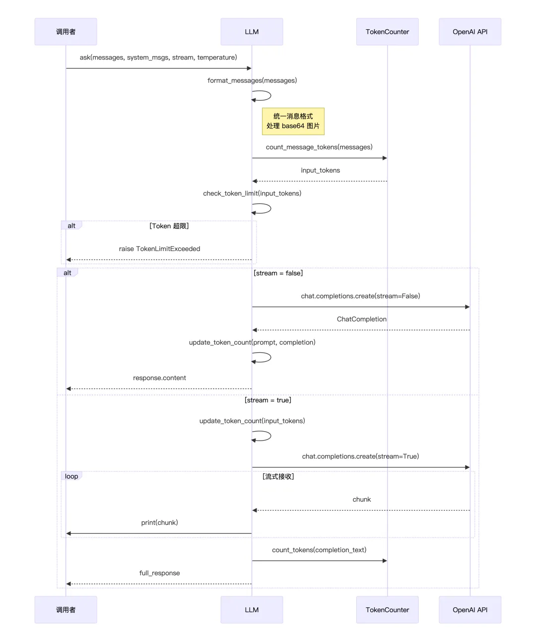 ask() 是最基础的对话方法。调用时首先将传入的消息列表格式化为 OpenAI API 标准格式,同时处理可能存在的 base64 图片。接着通过 TokenCounter 计算输入的 token 数量,并检查是否超过配置的限制,如果超限则直接抛出异常,不会重试。