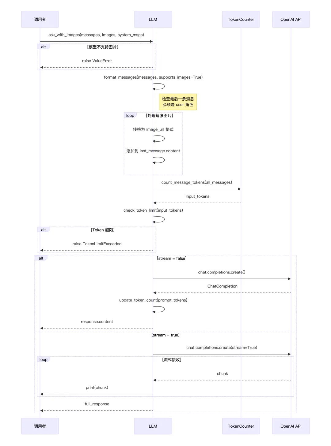 Token 计算时会根据图片的清晰度和尺寸计算额外的 token 开销。后续的 API 调用流程与 ask() 类似,支持流式和非流式两种模式。