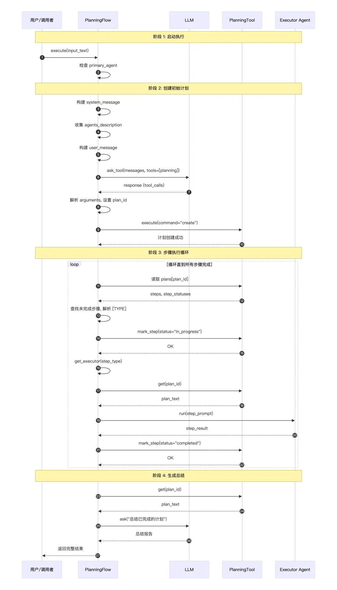 asyncdefexecute(self, input_text: str) -> str:"""Execute the planning flow with agents."""try:# 没有主 Agent 就直接报错ifnot self.primary_agent:raise ValueError("No primary agent available")# 让 LLM使用PlanningTool工具拟一个 planif input_text:await self._create_initial_plan(input_text)# 确认计划真的创建成功了if self.active_plan_id notin self.planning_tool.plans: logger.error(f"Plan creation failed. Plan ID {self.active_plan_id} not found in planning tool." )returnf"Failed to create plan for: {input_text}" result = ""whileTrue:# 找当前要执行的步骤 self.current_step_index, step_info = await self._get_current_step_info()# 没有更多步骤了 -> finalizeif self.current_step_index isNone: result += await self._finalize_plan()break# 为当前步骤选一个合适的Agent step_type = step_info.get("type") if step_info elseNone executor = self.get_executor(step_type)# 执行这个步骤 step_result = await self._execute_step(executor, step_info) result += step_result + "\n"# 如果 Agent 内部把自己状态标记为 FINISHED,就提前终止if hasattr(executor, "state") and executor.state == AgentState.FINISHED:breakreturn resultexcept Exception as e: logger.error(f"Error in PlanningFlow: {str(e)}")returnf"Execution failed: {str(e)}"