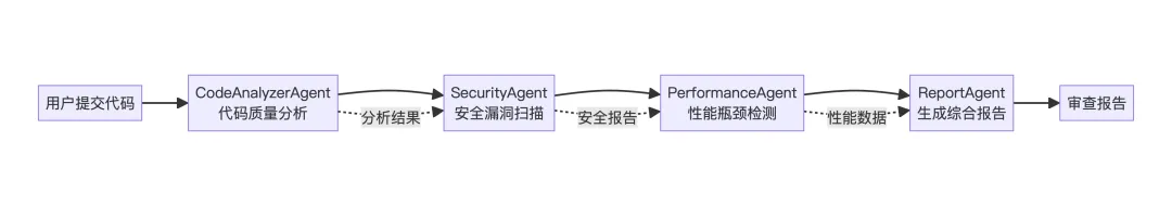 场景:代码审查流水线 – 依次进行代码分析、安全检查、性能评估。