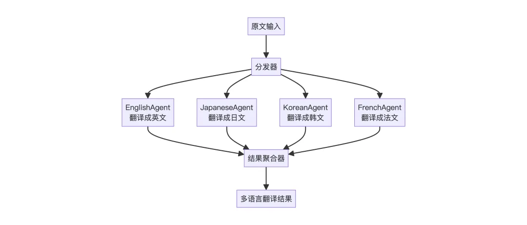 场景:多语言翻译系统 – 同时翻译成多种语言,最后汇总。