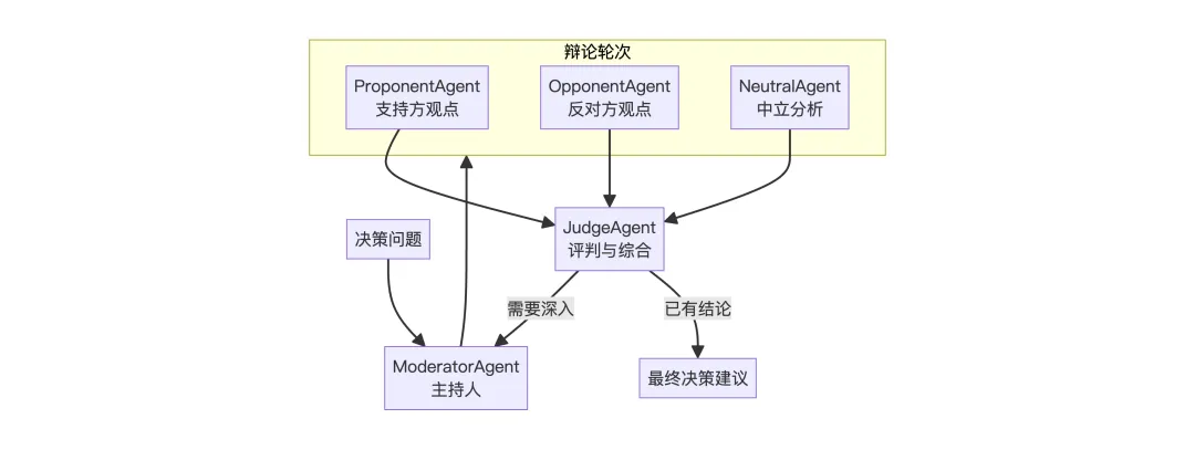 场景:决策辅助,多个 Agent 从不同角度辩论,最终综合决策