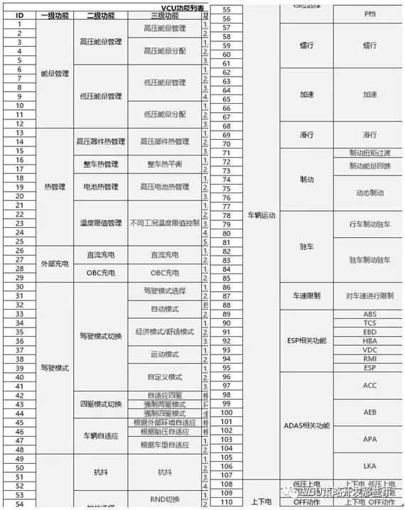 其中复杂度较高的功能模块,又可进一步分解到子功能需求。以某项目VCU功能清单为例,如下表: