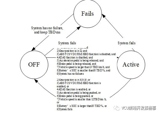 说明:对功能设计进行描述,说明功能实现形式以及功能要求。还以滑行回收为例:站在系统的角度,VCU内部设置与实施根据车速相关联的车辆目标减速度。中控面板提供驾驶员设置回收力度的接口。
