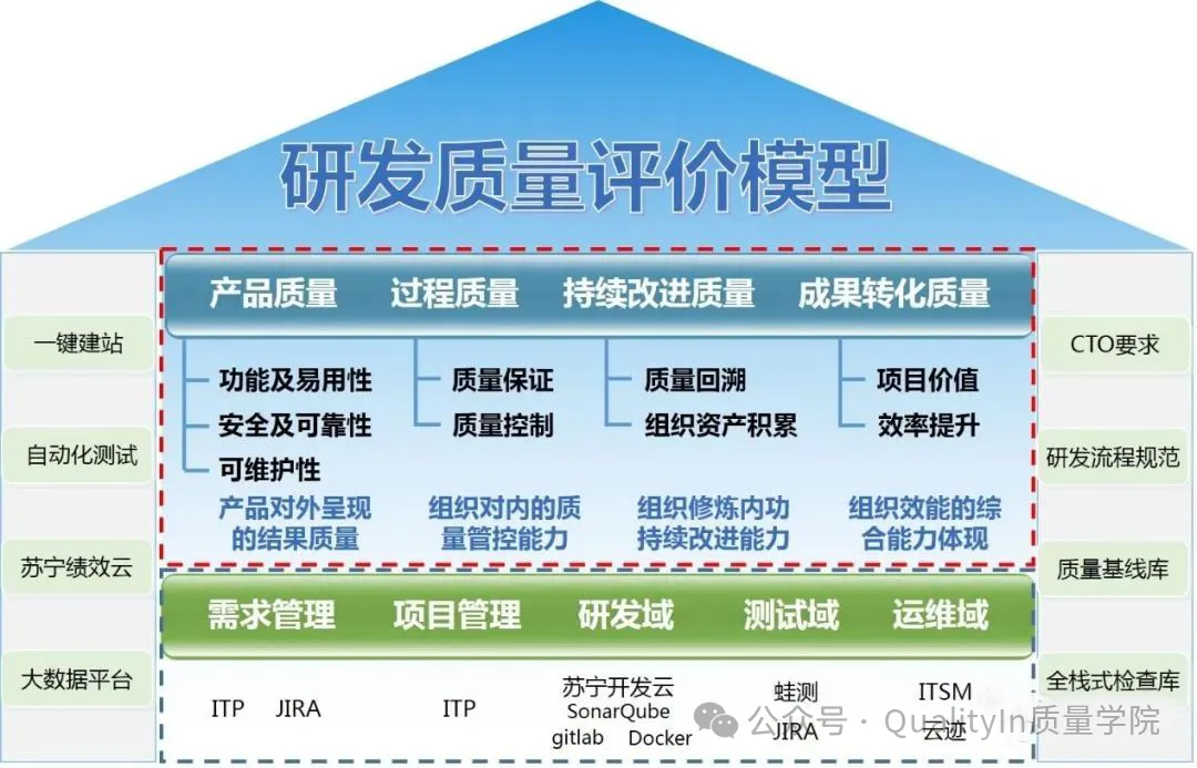 通过对一些经典软件质量模型(Mccall模型、Boehm模型、ISO9126模型)的研究,我们提炼了一套“研发质量评价模型”,其整体框架结构和体系支撑如下: