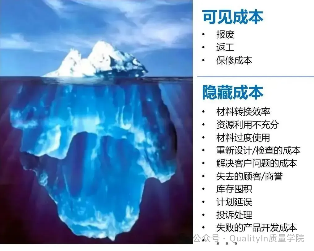 质量成本中可见的部分就像冰山上的一角,而大量的成本却隐藏在海平面以下,深不可测。比如:某汽车制造商发现某款汽车发动机设计存在缺陷,需要全部召回。这属于可见成本中的返工成本。