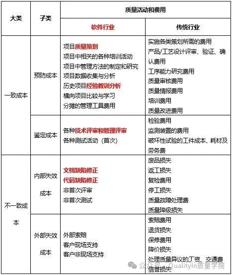 与传统制造行业相比,软件行业的主要成本类型为人力成本,对外提供的是无形产品或服务,在质量成本子类划分上也有所区别。下表为软件行业与传统行业质量成本活动和费用的构成: