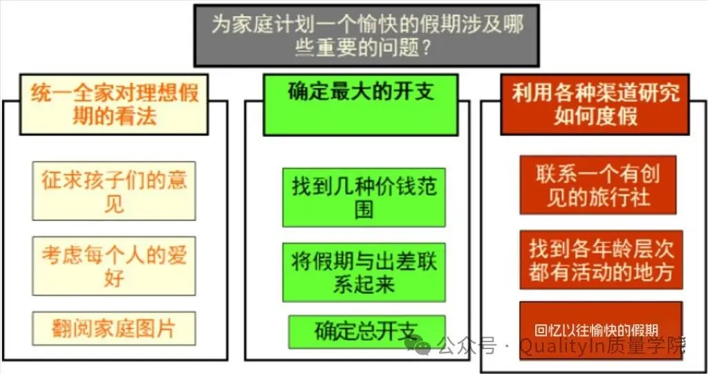 例如:需要制定一个愉快的假期出行计划,则可以和家人一起头脑风暴,再用亲和图把头脑风暴的想法进行聚合。下图是一个经典的亲和图例子:
