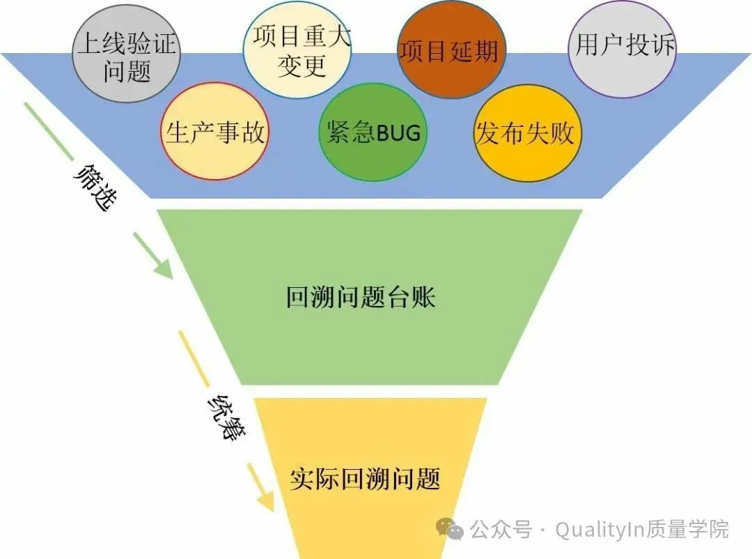 根据二八原则,质量人员会对问题进行统筹管理,从问题台账中挑选其中20%最值得回溯的问题。逐步建立回溯问题的筛选原则,比如只要满足以下任一情况则组织回溯: