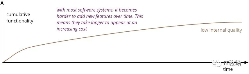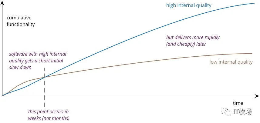 •忽视内部质量会导致 cruft 快速产生•这将进一步延缓功能开发•即使是一个伟大的团队也会产生这样的问题,但通过保持内部质量,可以控制它•高内部质量使团队能够以更少的工作量、时间和成本开发新功能