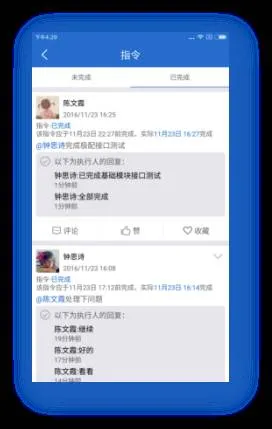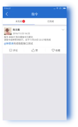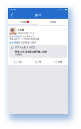 以任务分配为例,上司可在APP给下属下达指令,并指定完成指令的下属,系统会@该员工,并在该员工接受指令后显示指令的进度,全程跟进直至完成。
