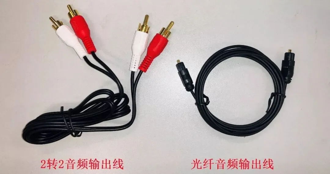 从上面的表格,我们可以看出连接的音频线(也就是我们连接TV盒子和电视或机顶盒的连接线)有两种,一种是2转2红、白头音频线,另一种是光纤音频线。那他们长什么样子呢?如下图: