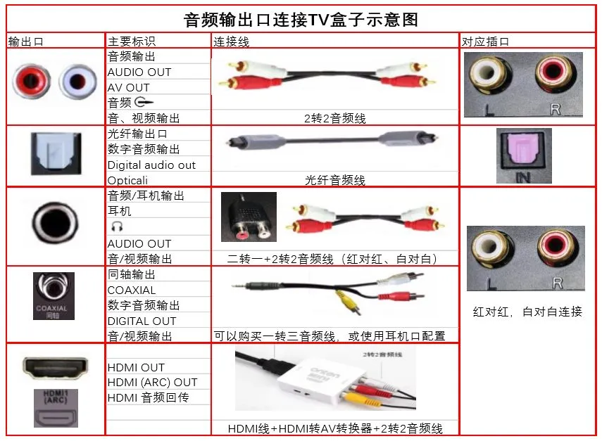 看完这个表,有没有豁然开朗的感觉?其实,整个连接过程就是想尽办法将音频设备(电视、机顶盒、电脑等)的输出口通过各种线转换到TV盒子的端口上。