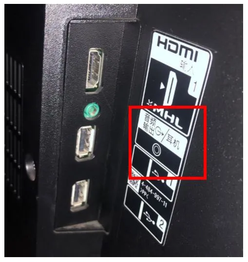 这是电视机后面的插口图片。这里的HDMI是输入,我们用不了,只有“音频输出/耳机”,所以,使用“二转一转换器+2转2音频线”即可。