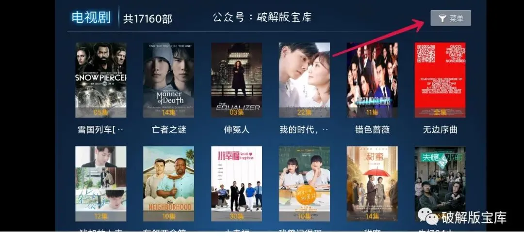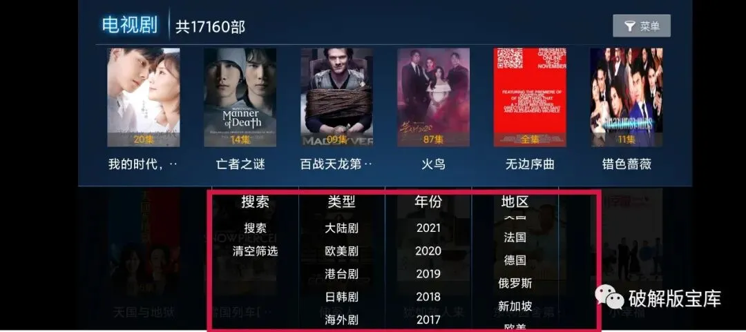『电视剧』分类中,拥有1.7万多部,并且还在不断增加中。右上角“菜单”可以筛选不同类型、年份、地区的视频,全部是超清画质。