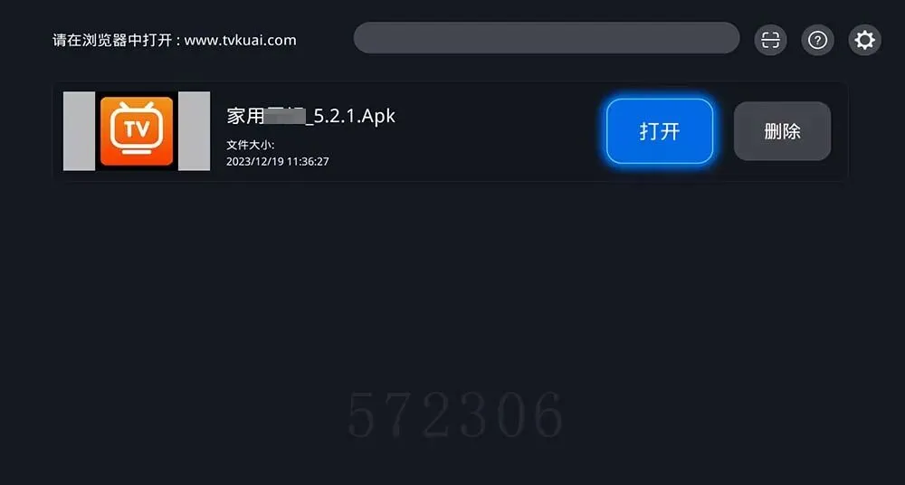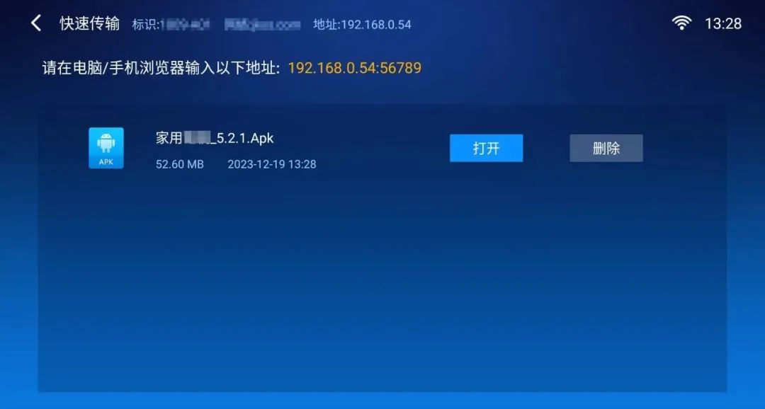 步骤三:等待上传完成,电视端快传助手列表中即显示已上传的文件,可以“打开”进行安装或查看了。