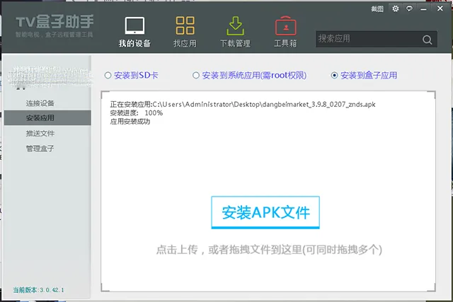 3.将需要安装的应用拖入窗口,耐心等待安装完成,返回智能电视/移动机顶盒,在 我的应用 中即可看到刚刚推送的软件。