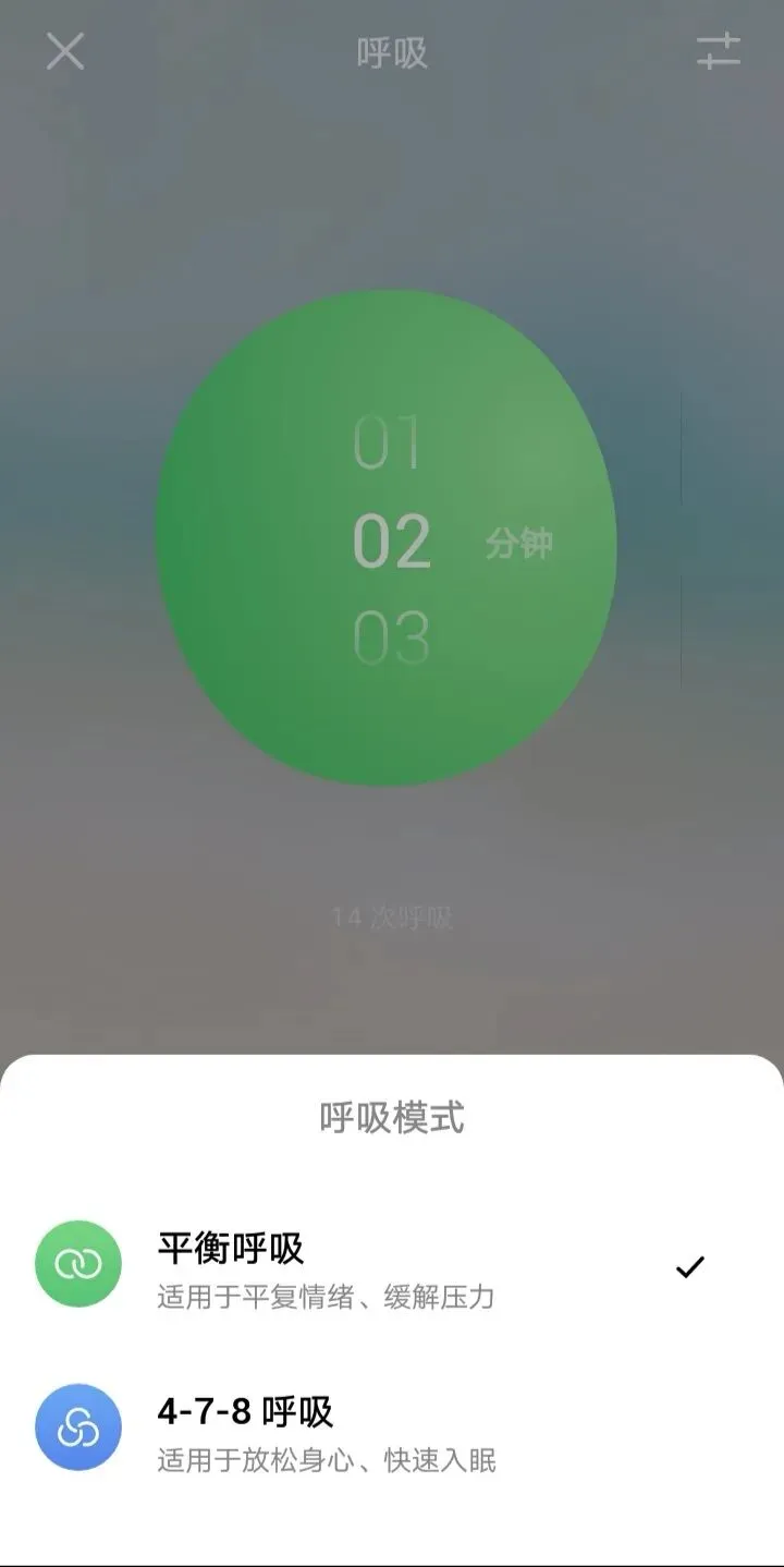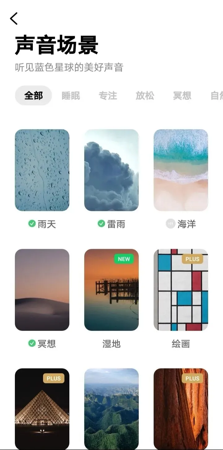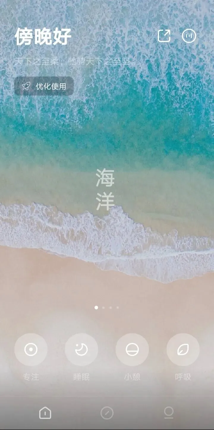 主页有四个按键进入专注、睡眠、小憩和呼吸状态。每个模块中都可以设定时间和声音,也可以在声音场景中选择自己喜欢的自然声音。