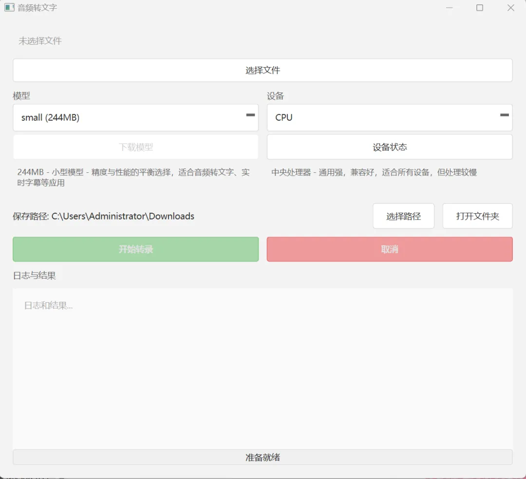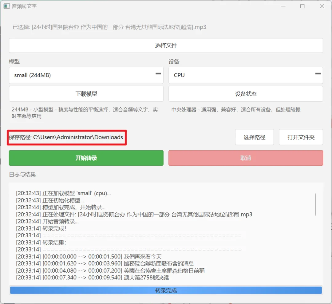 一般选small就OK,转完默认扔C盘Download,也能自己改路径。全程断网可用,隐私拉满。