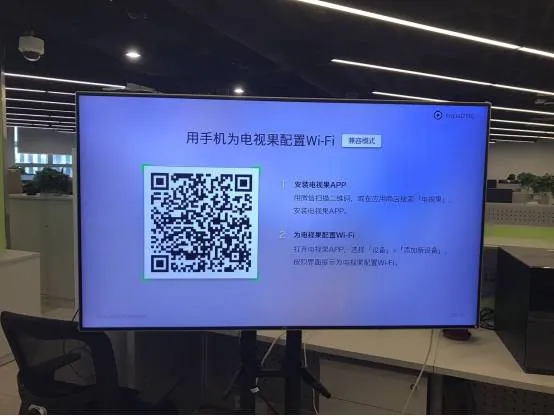 开机后,电视上会出现引导软件配置的画面,手机扫描二维码安装电视果手机APP。