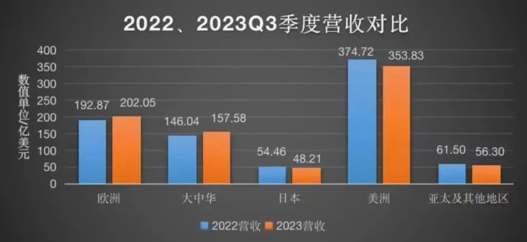 比如根据苹果公布的2023Q3财报数据显示,2023财年第3季度苹果净营收为817.97亿美元,同比下降1.4%;其中大中华区营收为157.58亿美元,与去年同期的146.04亿美元相比增长7.9%;大中华区营收占苹果整体营收的比重达到19.26%,而且大中华区也是增长速度最快的。