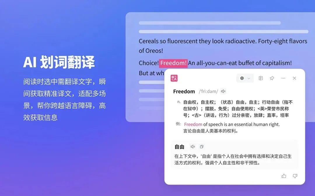 集成多模型 AI 能力,边浏览边调用,实现翻译、总结、创作一站式辅助。