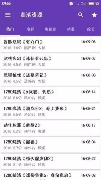 1、软件打开默认界面是高清资源界面,左上角可以看到高清资源四个字,这个资源提供的是资源的下载链接,可以选择需要的影视资源,然后看下载链接。