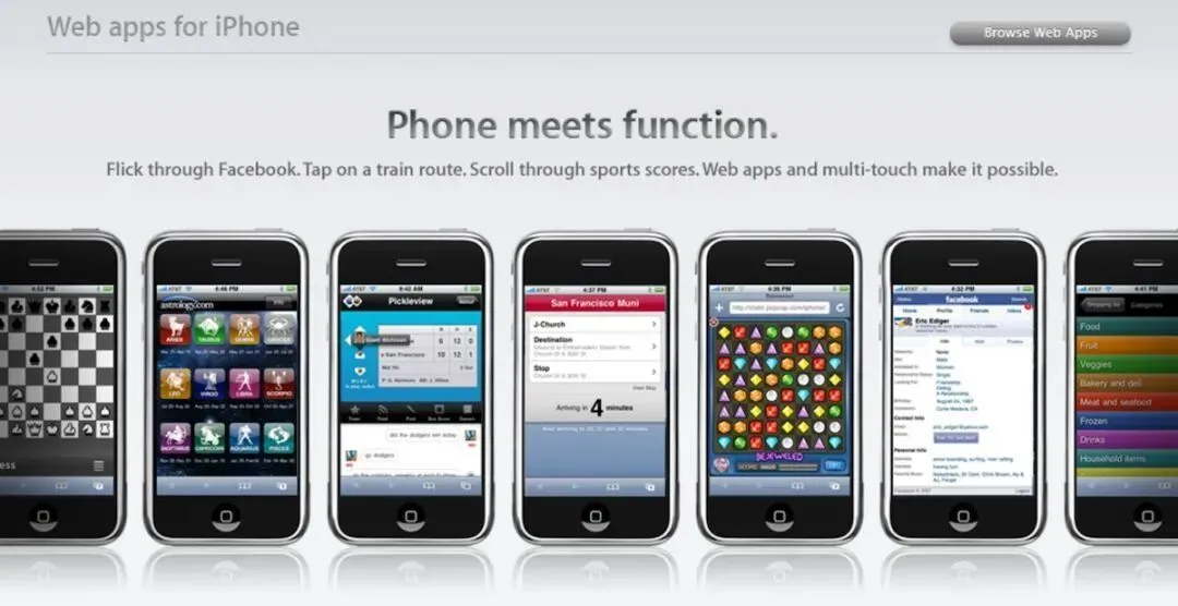 事实上,真正把手机应用推向大众视野的App Store,原先还是一个险些难产的事物。因为在乔布斯对iPhone的最初设想中,用户根本没有必要安装什么软件,所有的功能——除了通信之外——都能够、甚至应该通过Safari浏览器里得到满足,而开发者也只需要会使用HTML5编程就可以了,他们根本就不用去烦恼薅掉现在那些程序员们无数头发的适配问题。