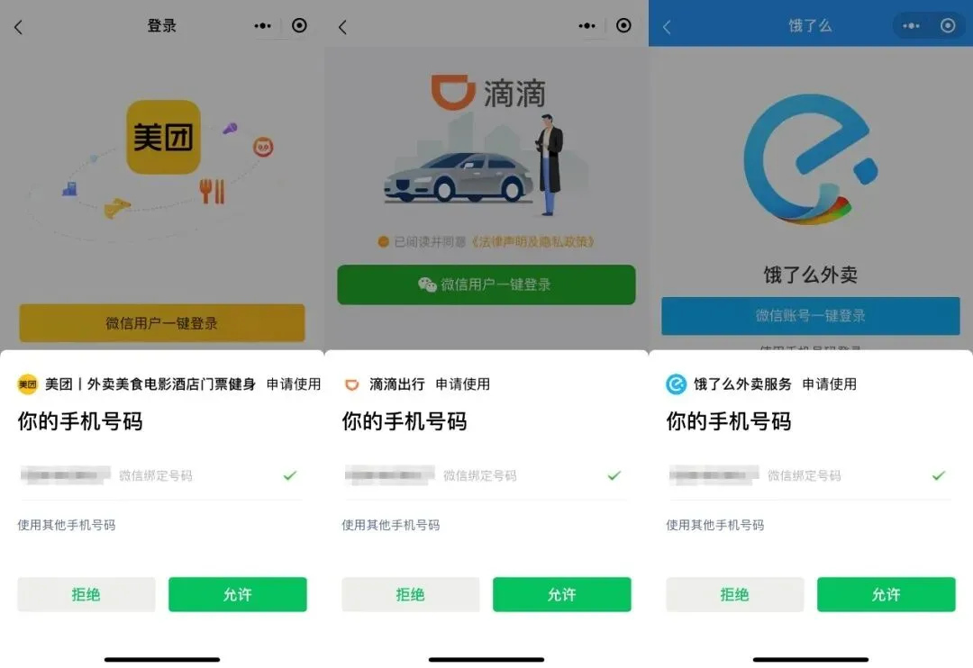 美团、饿了么和滴滴出行的小程序都能做到无障碍登录。用户只需要首先允许小程序获取你的微信信息资讯,再允许取得你的手机号码,就可以直接登录。