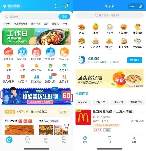 ▲ 左边是饿了么APP,右边是饿了么小程序